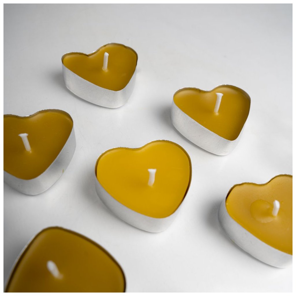 Ručně vyráběná čajová svíčka ve tvaru srdce ze včelího vosku. Malý detail, který potěší jako krásná dekorace, symbol lásky a milá pozornost pro každou příležitost.