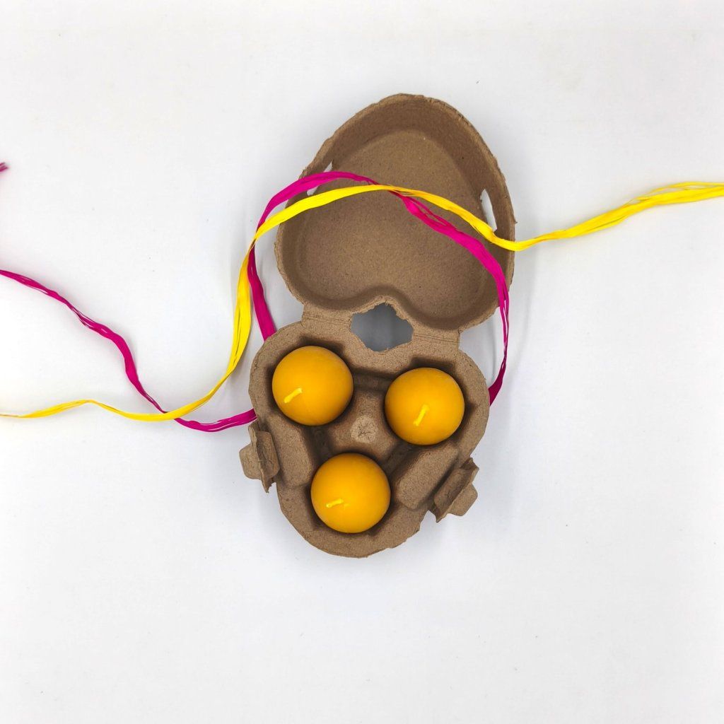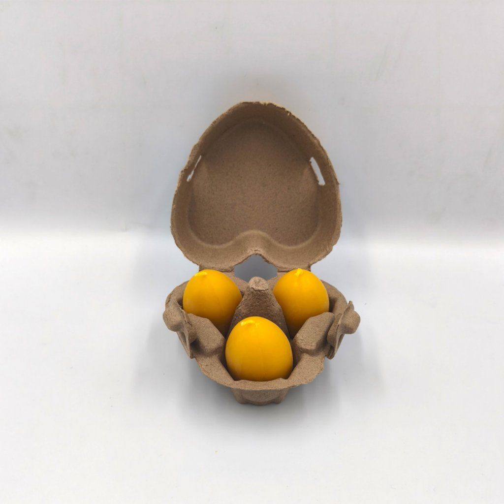 Ručně odlévaná svíčková vajíčka ze včelího vosku, zabalená po třech v papírovém srdíčkovém platu a převázaná barevnou stužkou. Originální dekorace i jarní voňavý dárek.